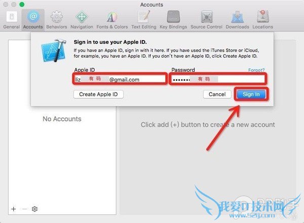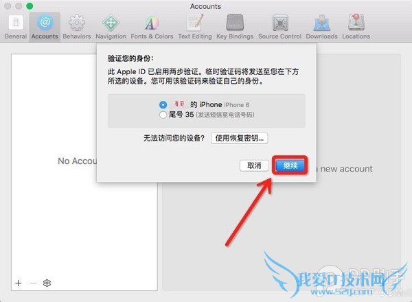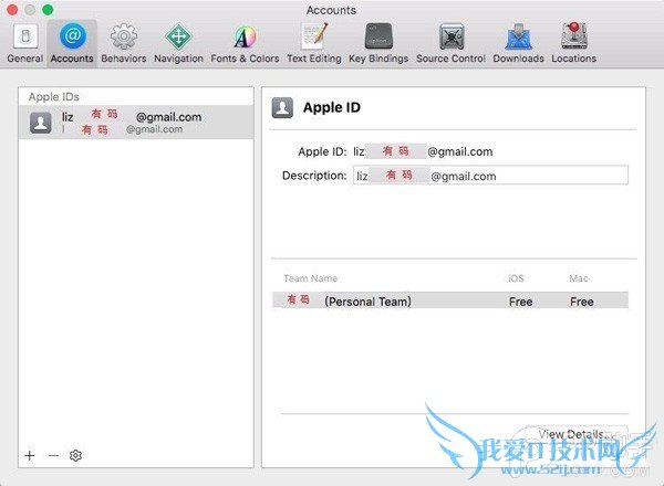5、修复代码签名问题,添加 Apple ID,已经开启两步验证的锋友需要验证一下,添加完成后如下图,关闭 Accounts 窗口,提示 Reset 的,请点击 Reset,不提示的请忽略此步,至此,代码签名问题已修复。