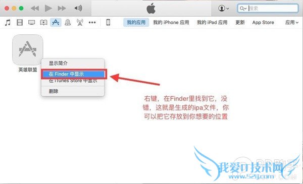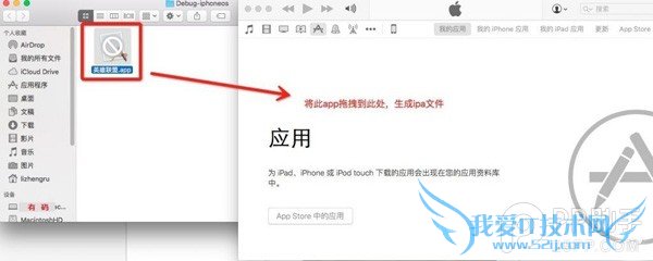 - 将找到的 XXXX.app 文件拖拽到打开的 iTunes 的“我的应用页面”空白处,这样就生成了最终的 XXXX.ipa 文件。