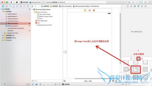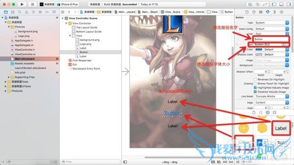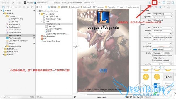 7、修改 View Controller 属性,添加图像视图,拖入 Label 和 Button 控件并适当修改其外观属性。