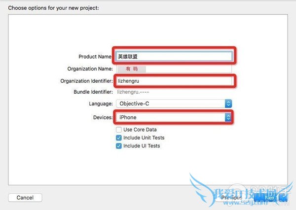 4、输入项目名称(Product Name)、公司标识前缀名(Organization identifier)、开发语言(Language)和设备(Devices),并点击下一步,然后选择工程保存的地方,点击 Create。