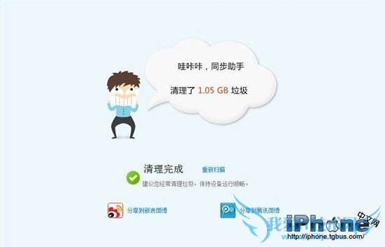 5、等待清理完成即可,最后就可以看到同步助手成功为您的iPhone6清理了多少垃圾缓存文件,如图所示。