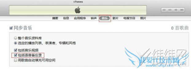 先将手机连上电脑,启动iTunes,我们会在装置中的音乐栏位看见“同步音乐”>>>“包含语音备忘录”,将这两个选项勾选后,接下来只要完成同步,这些录音档也就会从手机传到电脑中。