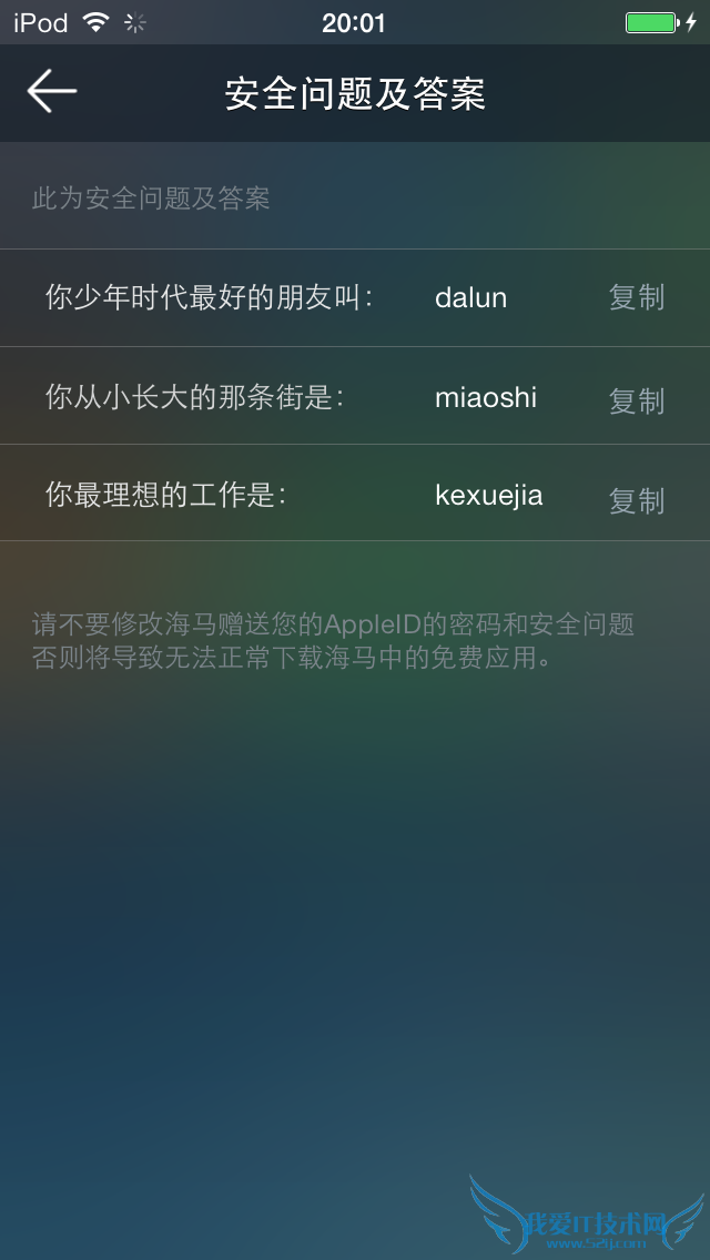 第四:进入海马赠送账号页面,选择【内购安全问题及答案】记录以下问题及答案: