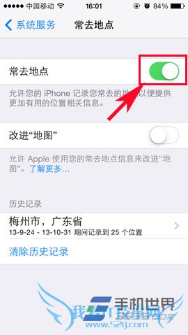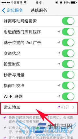 3)在“系统服务”界面就能看到“常去地点”功能了,点击进入后对“常去地点”栏的功能按钮进行关闭即可。