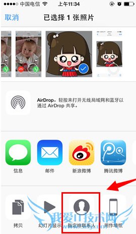 1)在IOS8桌面点击照片进入,在相册上找一张要设置大头像的照片点击,进入后再点击左下角【分享按钮】,然后再点击【指定给联系人】选取联系人;(如下图)