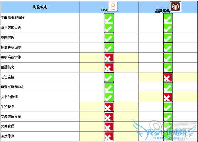 以下为大家整理了iOS8系统自带功能与越狱系统所能实现的功能对比表: