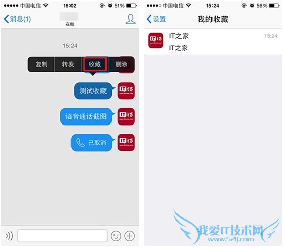 iPhone版QQ v4.6增加了“我的收藏”功能,用户在聊天中通过长按聊天信息即可进行收藏操作,收藏内容可以在设置界面“我的收藏”中查看。该功能由腾讯微云提供支持,收藏内容可同步至电脑端。