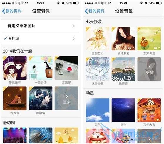 新版QQ允许用户自定义个人资料页面背景,点击背景即可进入该功能,其中包括静态图、动态图、动画以及黄钻专属的七天换装版背景,并支持自定义,方便用户打造个性化资料卡。