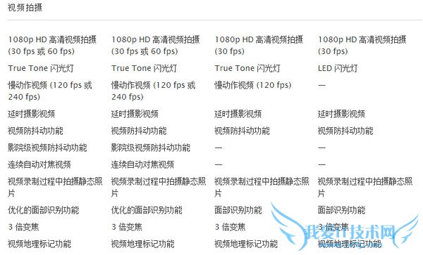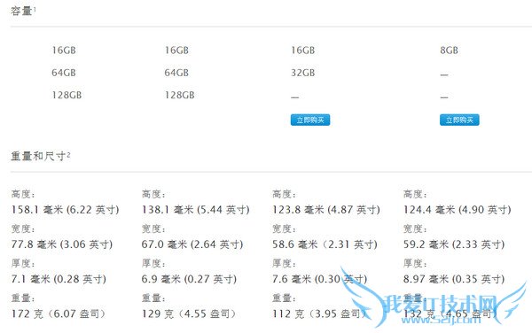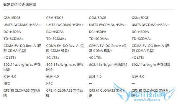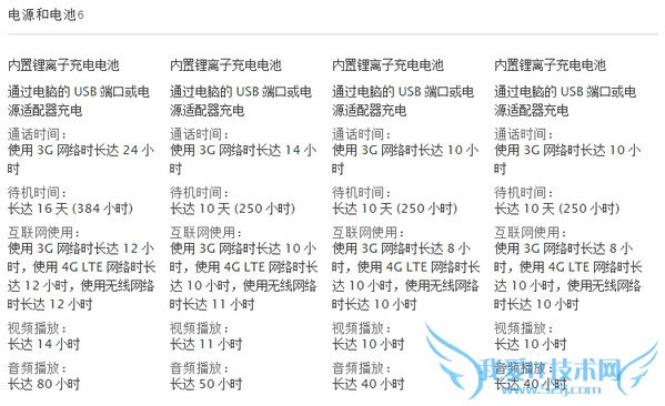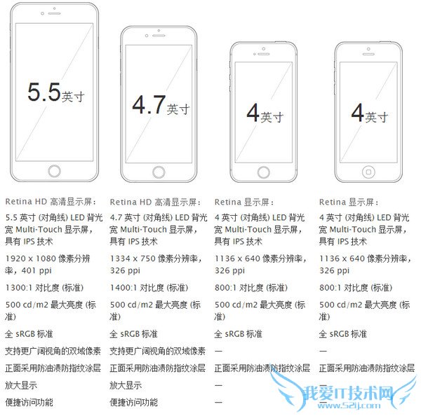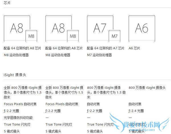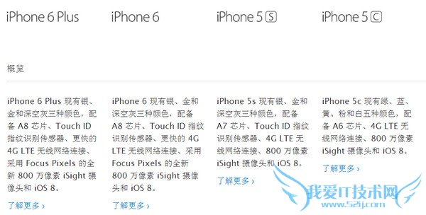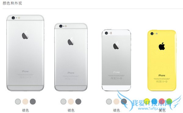iPhone 6参数配置信息从左到右分别是 iPhone 6 Plus 、iPhone 6、iPhone 5S、iPhone 5C。