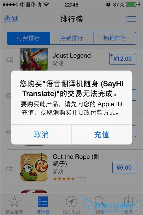 STEP7:如果你在注册苹果账户时未正确配置付款信息。那么此时将会提示你先充值到你的Apple ID账户中。点击“充值”按钮继续。