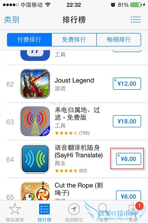 STEP2:随后你可以通过“精品推荐”或“排行榜”来寻找你希望付费购买的应用资源。找到后可直接点击其右方的价格按钮。