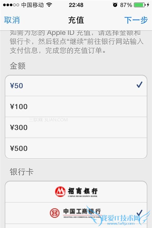 STEP8:接下来会提示选择充值金额及选择银行卡。苹果的充值金额不能自定义,最低50元人民币起;银行卡则支持大部分境内的储蓄卡和信用卡。