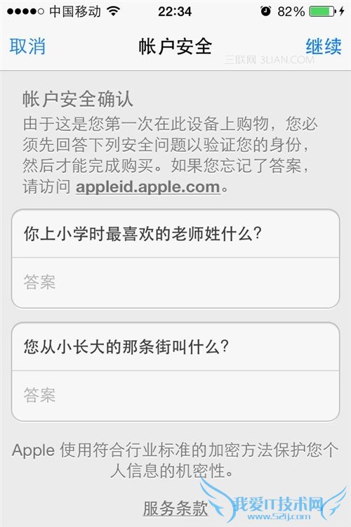 STEP5:根据自己当初注册苹果账户时填写的相关信息,来完成账户安全的验证。如果忘记这些问题的答案,可访问appleid.apple.com来重置问题和答案。输入完成后点击右上方“继续”按钮。