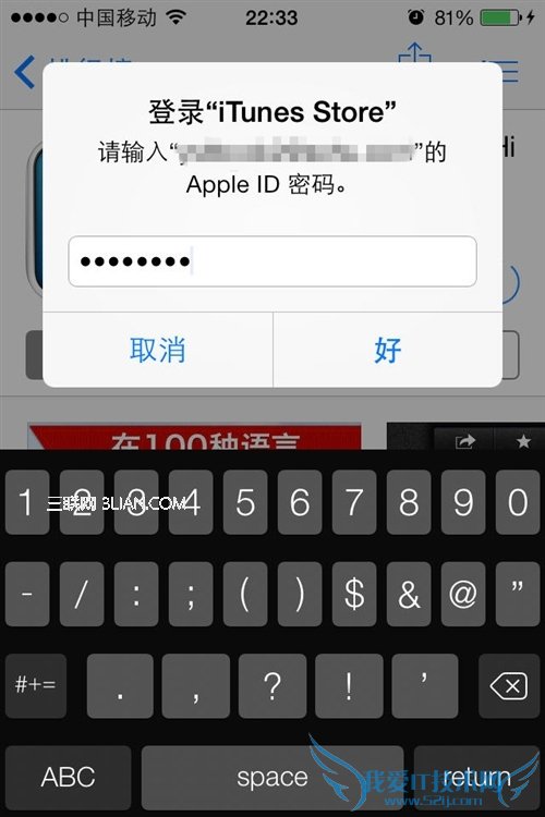 STEP12:完成充值后,再次返回应用资源的购买界面,点击购买按钮后会再一次提示输入苹果账户密码;完成输入后也就完成了购买。App Store会自动开始下载及安装。随后我们在iPhone主屏幕上即可看到安装好的付费应用了。