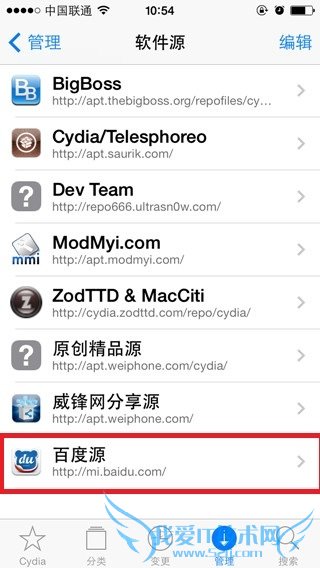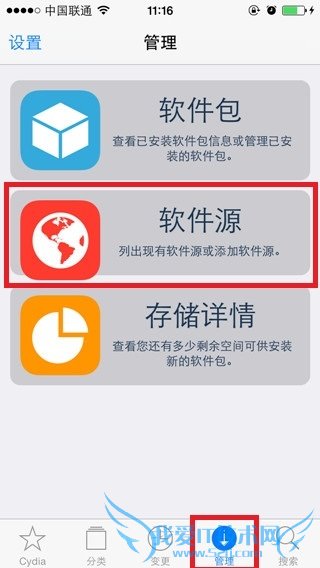 2、进入Cydia之后在下面菜单中找到管理选项。