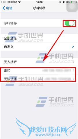 2)接着点击【呼叫转移】,打开【呼叫转移】右边开关,再输入【正忙】和【无法接通】要转移的【电话号码】。(如下图)
