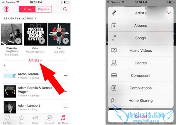 3、最后,用户可以打开iOS设备上的“音乐”应用,选择“我的音乐”,在显示“艺术家”栏目的地方呼出菜单,“家庭共享”功能就在这里。