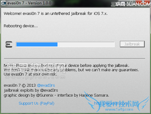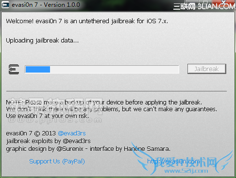 点击打开已下载好的越狱工具evasi0n,运行evasi0n,点击jailbreak开始越狱