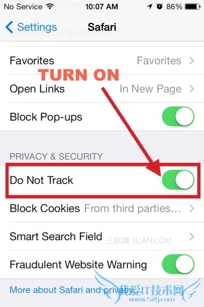 iOS 7上另一个关于隐私和安全性的功能,是隐藏在Safari浏览器中的“不跟踪”功能,这似乎是iOS 6私密浏览功能的升级版,更好地向桌面Safari版本靠近。进入“设置”>“ Safari浏览器”,向下拉至“隐私与安全性”,便可看到“不跟踪”.开启之后,能够限制网站追踪你的网上行为,从而避免广告和其他服务。