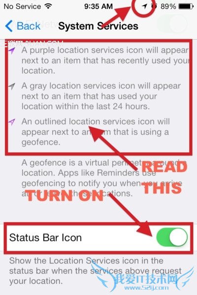 在iOS 7隐私--位置服务面板的底部有个“隐私版块”,如果使用iPhone有数个月以上,你应该会有几十个App在清单上面,如果滑到清单的最底部,你会看见传说中的系统服务设置(设置-隐私-位置服务-系统服务 ),并看到一系列紫色箭头图标的解释,如图所示,小箭头有3种不同的颜色,显示了使用你地理位置的不同状况。