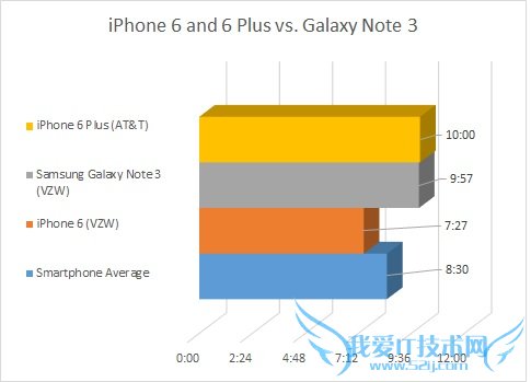 至于iPhone 6 Plus,其在AT&T网络上实现了高达10小时的续航。相比之下,运行于Verizon网络上的Galaxy Note 3则稍逊一些。