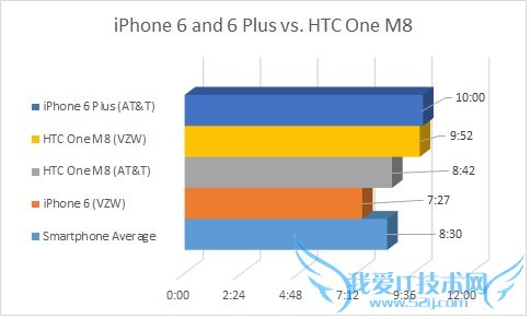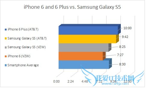 总体而言:测试中,在Verizon网络下,iPhone 6的“平均电池寿命”只有7小时27分钟,低于同类产品8小时30分钟的平均值。
