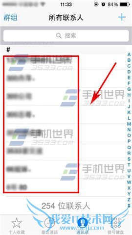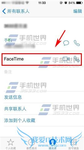 2)在联系人界面选择一个【联系人】,并点击【FaceTime】即可进行视频通话。(PS:需要对方的iPhone手机支持FaceTime方可视频通话)(如下图)