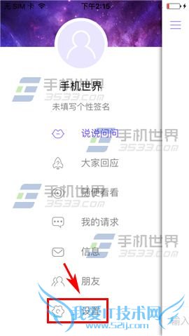 1)打开小灵灵进入应用后点击左上角【三】,接着点击【设置】。(如下图)
