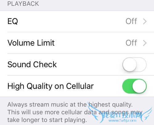 2.Music设置:在设置-》“Music”条目中出现了新的选项,允许在使用蜂窝网络数据下依然下载和视听高品质音乐,如果你不差流量的话。