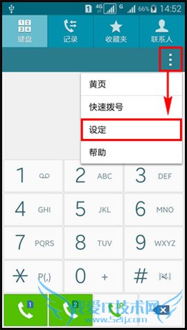 1)打开三星E7拨号界面点击【三点】选择【设定】。(如下图)
