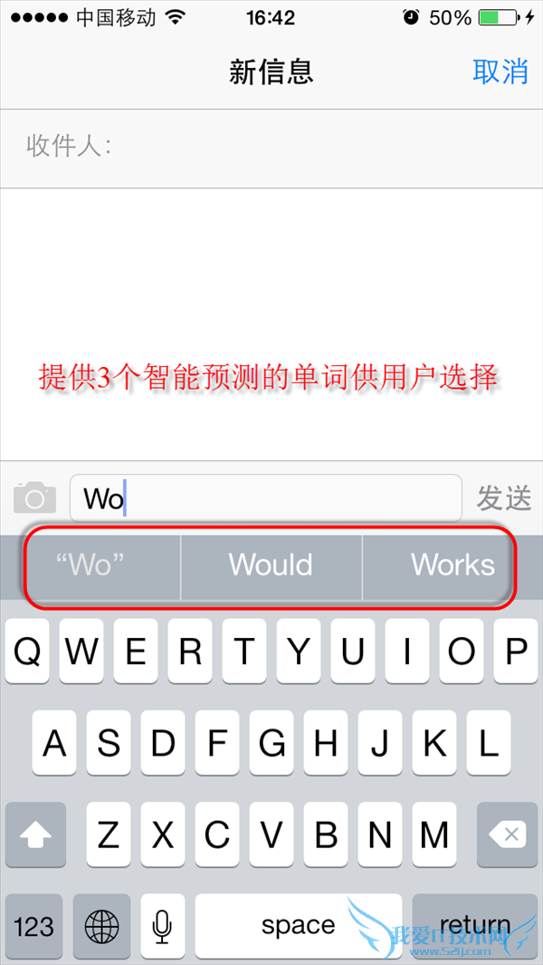 然后在任一输入状态下,当用户输入完当前单词之后,QuickType会提供3个智能预测的单词供用户选择。当然,如果你不喜欢这种“输入建议”,也可以轻松移除。