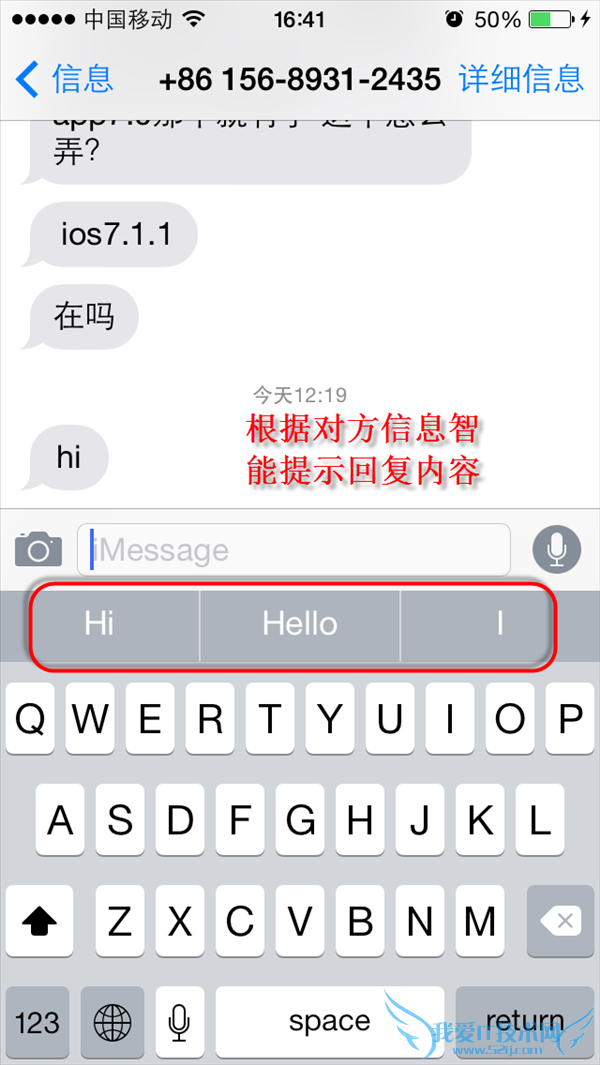 该功能另一大亮点是,它可以智能的帮我们判定和给出回复提示。比如对方一个“hi”的消息, QuickType就会在输入法中提示你输入“Hi”或“Hello”相当的智能。