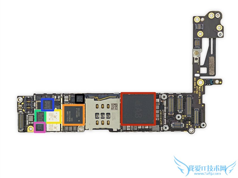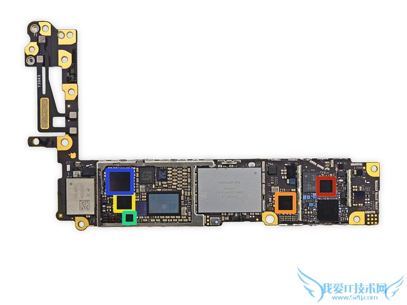 其他一致:APL1011 A8处理器(红色)、Skyworks 77802-23 Low Band LTE PAD(黄色)、Avago A8020 High Band PAD(绿色)、Avago A8010 Ultra High Band PA + FBARs(蓝色)。