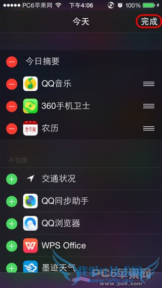 2、进入通知中心的编辑模式,会看到有两个部分:前方标记是红色的是当前已经在通知中心里显示的栏目;前方标记是绿色的是还未添加至通知中心的栏目。下图所示就是已添加的部分。