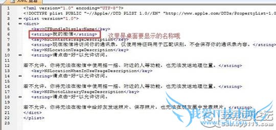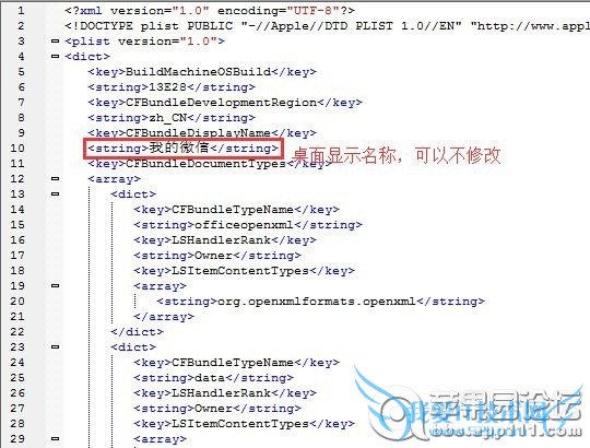 修改“CFBundleDisplayName”下面的微信名称,据称这个才是桌面上显示的名称,如下图