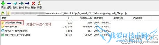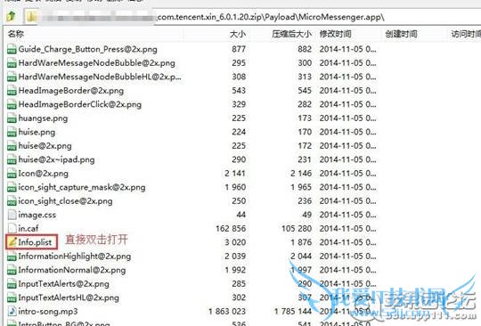 4、打开改后后的zip文件包,一定要直接打开!!!打开后到路劲/Payload/MicroMessenger.app/下找到“info.plist”并双击打开