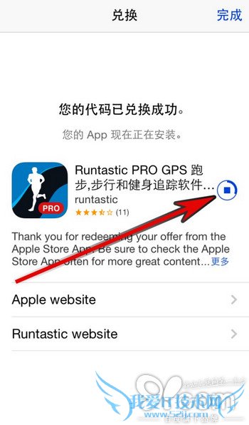 稍等片刻,即可看见「您的代码已兑换成功」提示页面。同时你还可以看见应用程序的安装进度(如图)。点击页面右上角的「完成」按钮即可返回至 App Store。