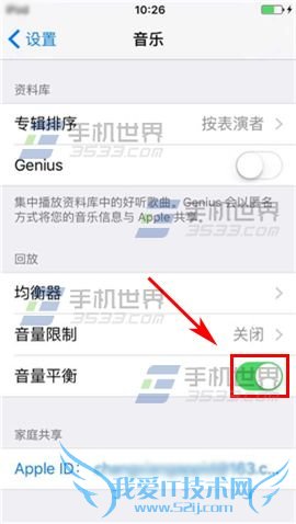 进入设置界面后点击【音乐】,接着打开【音量平衡】右边开关即可。(如下图)