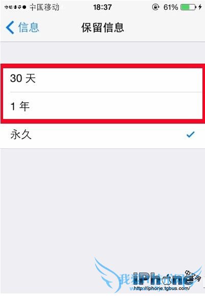 2.进入【保留信息】界面后,大家就能看到选项了,可以保留短信息30天、1年或者永久保留。根据大家的需要进行设置即可。