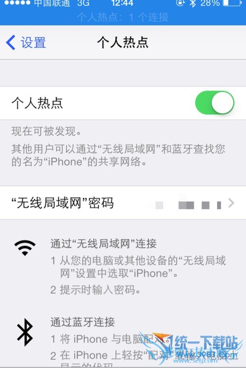 6、当有人连接到了苹果5s的个人热点时,会在手机屏幕的顶部看到个人热点连接数量的显示状态,如图所示