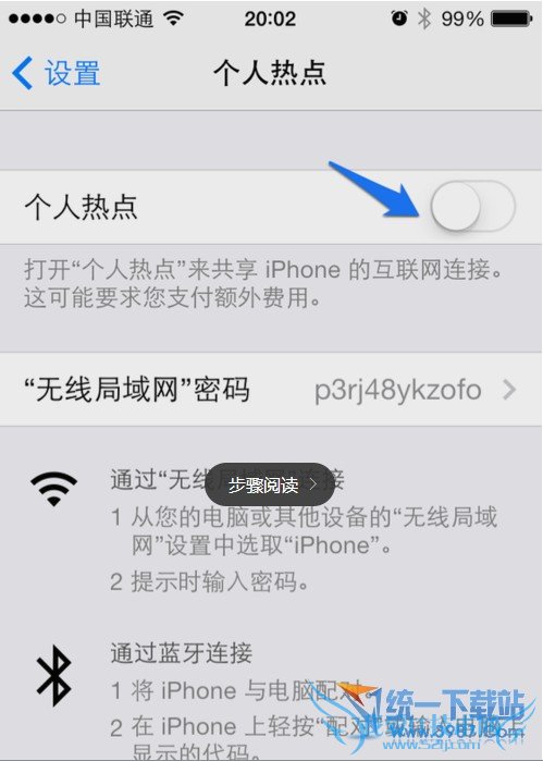 3、接下来在个人热点的设置界面中,打开个人热点的“开关”即可,如图所示