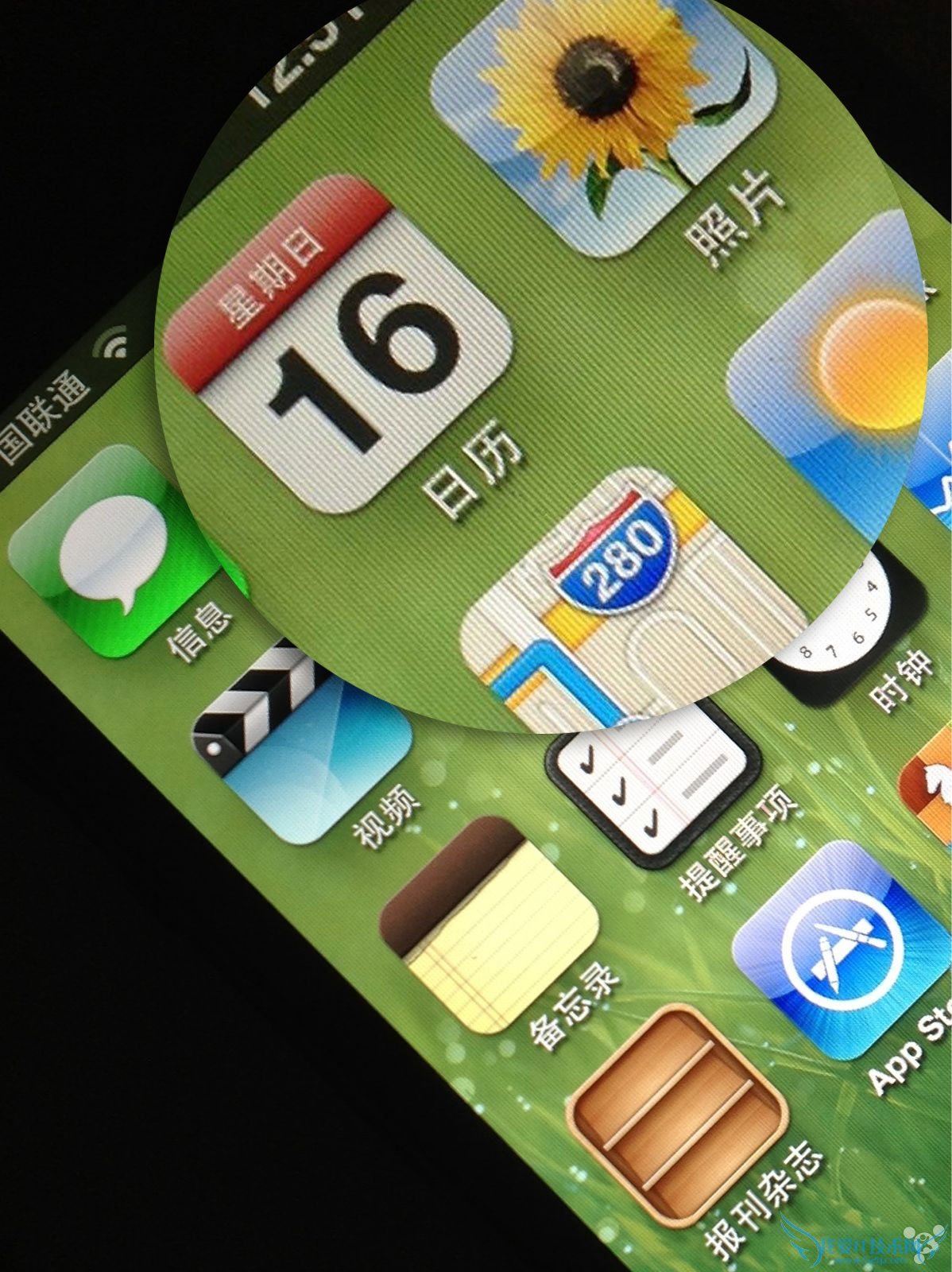 IOS6系统的点亮屏幕不要解锁,看滑动杆周围的灰色区域,在高亮度白色日光灯(如苹果店那种)下, 轻微改变角度(横纹就上下,竖纹左右) 较明显能看出的屏幕应改为有纹屏。