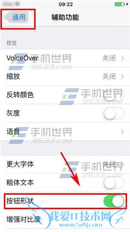 2)接着点击【辅助功能】,最后开启【按钮形状】右边滑块,即可看到左上角按钮形状已发生变化。(如下图)