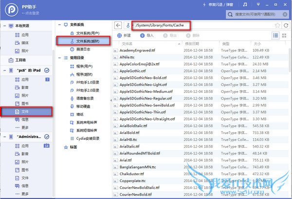第一步、你需要有一个资源管理器,PP助手(Win版、Mac版)、91助手、iTools(Win版、Mac版)均可,小编以PP助手为例子。打开PP助手的文件管理器,进入越狱后文件系统,找到:/System/Library/Fonts/Cache文件夹。。