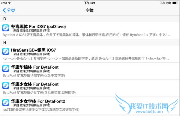 更换 iOS 8 以上设备的字体目前来说有两种方式,一个是直接在 Cydia 里面通过现有的源安装,这样的话可用的字体相对来说比较少,大多数是一些常见的字体,例如下图当中的,黑体、宋体、楷体和雅黑等等,怎么添加呢?