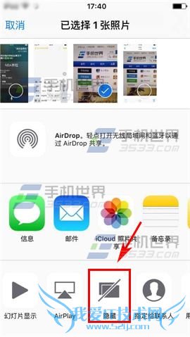 2)接着点击【隐藏】,选择【隐藏照片】即可。(如下图)