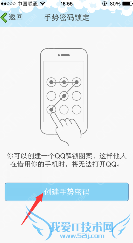 4、系统会直接提示大家设置手势密码,创建一个QQ解锁图案,如图;