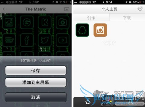 点选自己心仪的图标,在弹出的菜单中选择“保存”,图标会被收藏进右下角“个人主页”的下载页中。如果这时选择的是“添加到主屏幕”,则会直接进入到图标设置阶段。