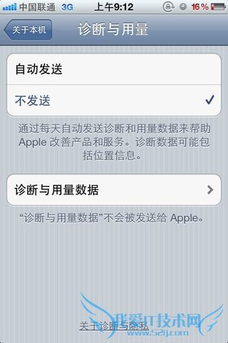 第二步:在关于页面,滑动屏幕到底部然后点击诊断和用量(Diagnostics &Usage)菜单,选择不发送即可。该选项主要是帮助苹果提升产品质量会自动发送一些诊断信息,该信息可能会包含用户的位置信息等。如果按照上述方法操作,你的iphone将不再自动发送任何信息。