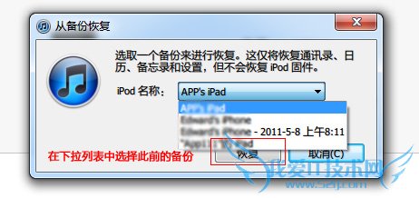 5、大约三分钟左右的时间,我们的设备就已经恢复到了iOS8.1系统,最后一步是将备份的数据恢复到新系统中,鼠标右键点击设备的名称,选择“从备份中恢复…”(选择“更新”按钮的,不需要再恢复备份,激活之后即可看到):